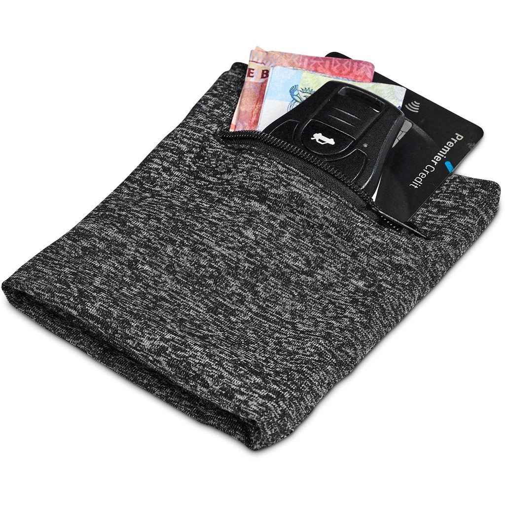 Soft, comfortable stretch fabric wrist band, with a zip pocket for storage of cards, cash and keys. Especially useful for running, cycling, training and other sporting activities.