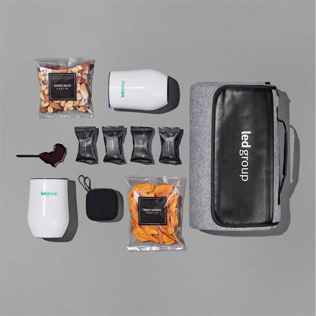 The Yatta range of hampers is expertly crafted to provide a delightful experience with a curated selection of premium items and edible treats. Elegantly presented in a Yatta drawstring bag, this hamper is further encased in a durable Dark Grey RPET felt gift bag.